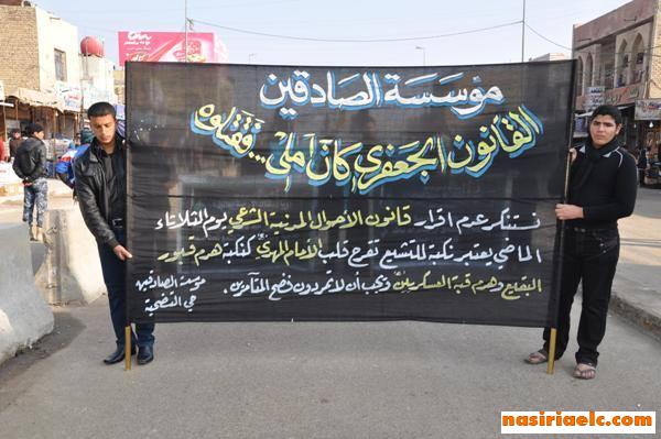 ولتنبيه الناس من غفلتها عن هذه الذكرى اقمنا مسيرة عزائية انطلقت باتجاه ساحة الحبوبي وسط الناصريه ، كما تضمنت المسيرة رفع لافتات تطالب مجلس الوزراء بإعادة اقرار قانوني القضاء والاحوال الشخصية الجعفرية التي تمثل منهج رسول الله محمد صلى الله عليه واله وسلم ولنجعل من احتفالنا ثمرة عملية .