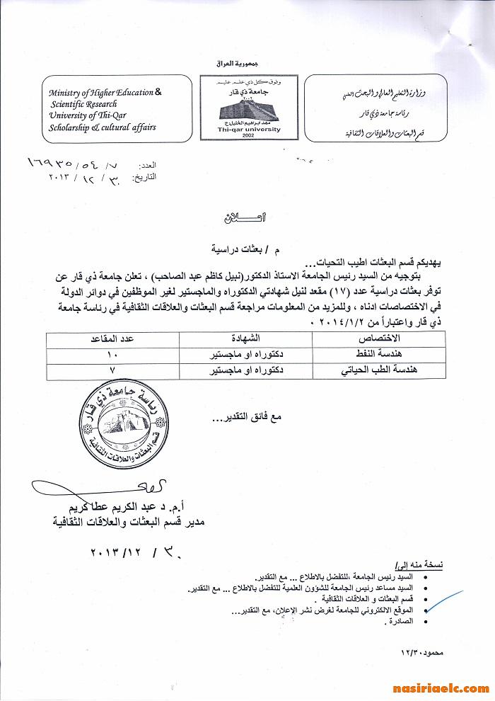 واشار قسم البعثات والعلاقات الثقافية في جامعة ذي قار الى ضرورة مراجعته من اصحاب الاختصاصات الراغبين في الدراسة اليوم الخميس 2 من كانون الثاني لعام 2014 .