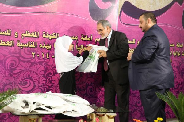 وبين الكويتي ” ضمن منهاج الحفل القاء جزء من خطبة الزهراء بصوت الطفلة مريم ثم كرمت أمانة مسجد الكوفة الطالبات اللاتي بلغن سن التكليف الشرعي والتي بلغن 25 طالبة تراوح تاريخ ولادتهم ضمن الفترة مابين وفاة الزهراء الى ولادتها تـأسيا بحجابها وعفتها عليها السلام”.