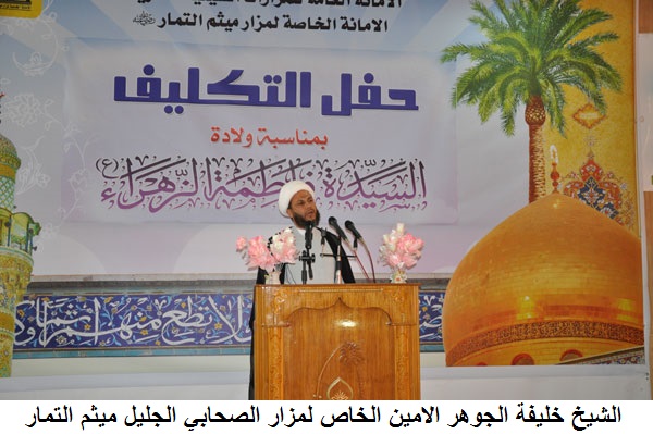 وقال الشيخ خليفة الجوهر الامين الخاص لمزار الصحابي الجليل ميثم التمار ان ” اقامتنا لهذا الحفل السنوي هو لتذكير الفتيات اللواتي بلغن سن التكليف الشرعي بانهن قد انتقلن من مرحلة الطفولة الى مرحلة البلوغ وانهن ليس فقط اصبحن مكلفات وانما تشرفوا بطاعة الله وانهن محل لخطابه جل وعلا واوضحت لهن ماذا يجب عليهن من العبادات كالصلاة والصوم والالتزام بالحجاب والعفة وسائر التكاليف الواجبة على كل مكلف”.