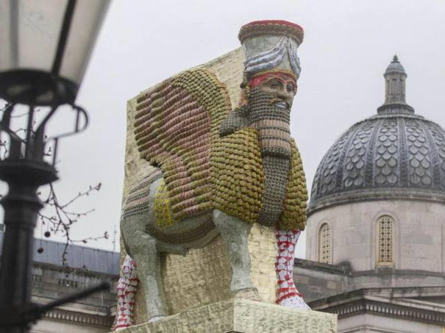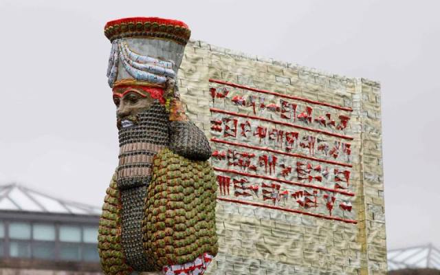 من جهتها ذكرت “رويترز” أنه تم عرض تمثال الثور المجنح الآشوري القديم الذي دمره مقاتلو “داعش” في عام 2015 ثم أعيد صياغته في تغليف المواد الغذائية المعاد تدويره في الشرق الأوسط في ميدان
