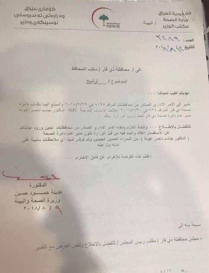 وأضافت الوثيقة أن “وزارة الصحة ستتخذ اللازم بإلغاء الأمر الإداري الصادر من محافظة ذي قار، لحين ورود الإجابة من المحافظة والبت فيه من قبلها”.