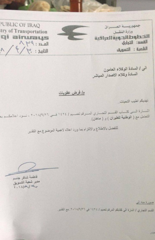 وطبقاً لوثيقة حصلت عليها جريدة الناصرية الالكترونية، أن “الخطوط الجوية العراقية تنفذ العقوبات الاميركية على الطيران المدني الإيراني”.