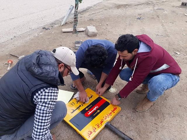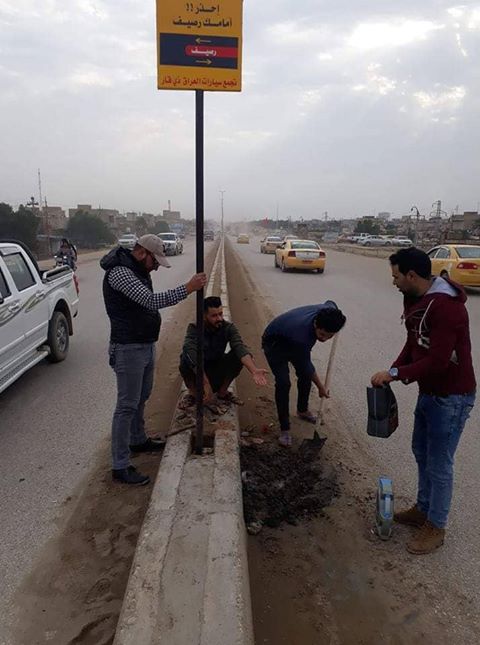 نظم عدد من الشباب في محافظة ذي قار، حملة تطوعية لنصب علامات مرورية لتجنب حوادث السيارات قرب جسر الفداء، وسط الناصرية.