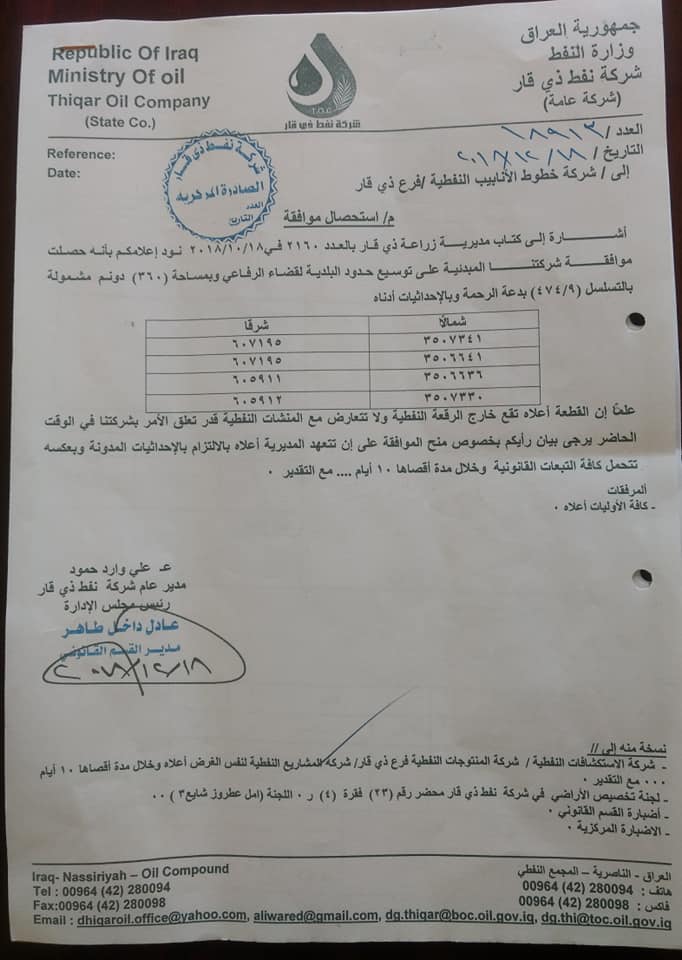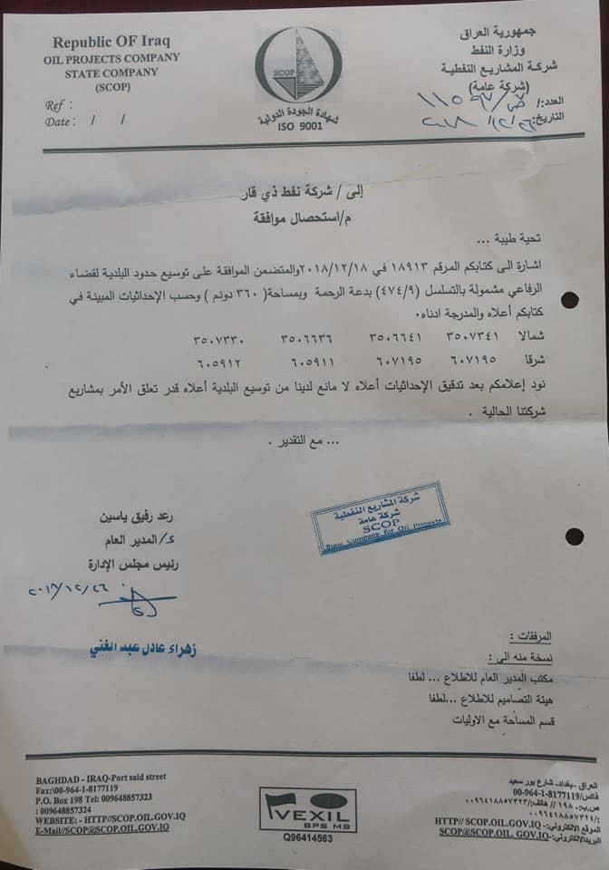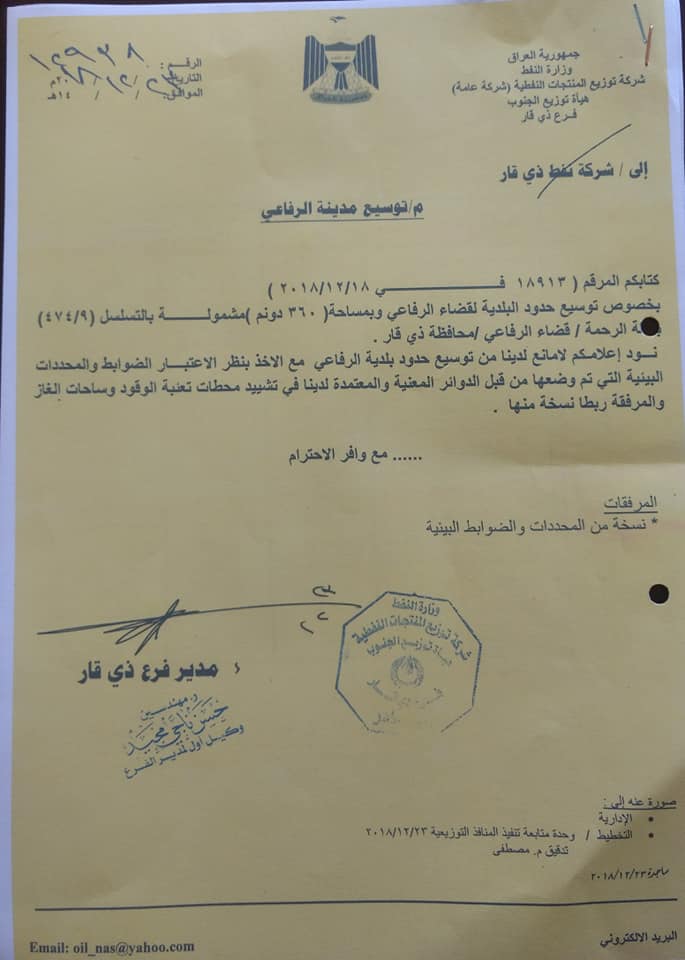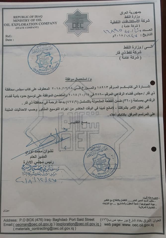 وقال إعلام مجلس قضاء الرفاعي، بحسب الوثائق، التي حصلت جريدة الناصرية الالكترونية على نسخة منها، أنه “بناءا على اخر مخاطبة لمجلس قضاء الرفاعي، الى شركة الاستكشافات النفطية والشركات النفطية الاخرى حصلت الموافقة على توسيع حدود بلدية الرفاع بمساحة460 دونم”.