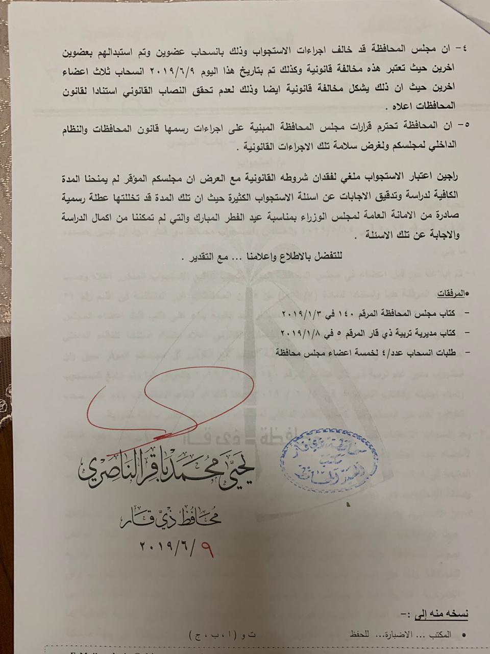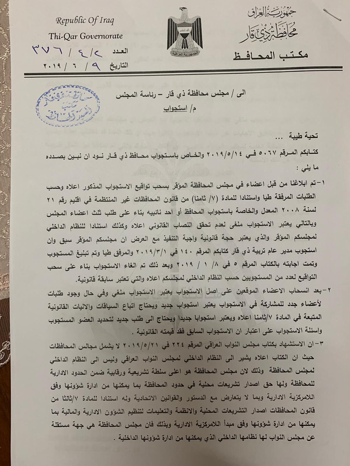 بالوثيقة…محافظ ذي قار يطعن بقانونية جلسة استجوابه
