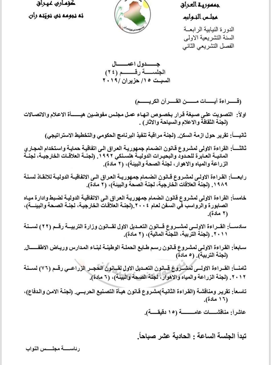 حصلت جريدة الناصرية الالكترونية، على وثيقة توضح جدول أعمال جلسة اليوم السبت لمجلس النواب، فيما بينت الوثيقة “أن جدول الاعمال يتضمن التصويت على صيغة قرار بشأن أنهاء عمل مجلس مفوضين هيئة الإعلام والأتصالات.