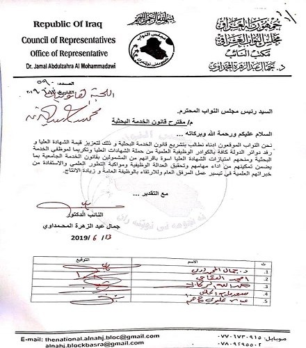 جمع النائب عن كتلة النهج الوطني جمال المحمداوي ، تواقيعاً برلمانية لتشريع قانون الخدمة البحثية والذي بدوره ينصف حملة الشهادات العليا في وزارات الدولة خارج وزارتي التعليم العالي ووزارة التربية ويزيد مخصصاتهم اسوة بأقرانهم المشمولين بقانون الخدمة الجامعية.