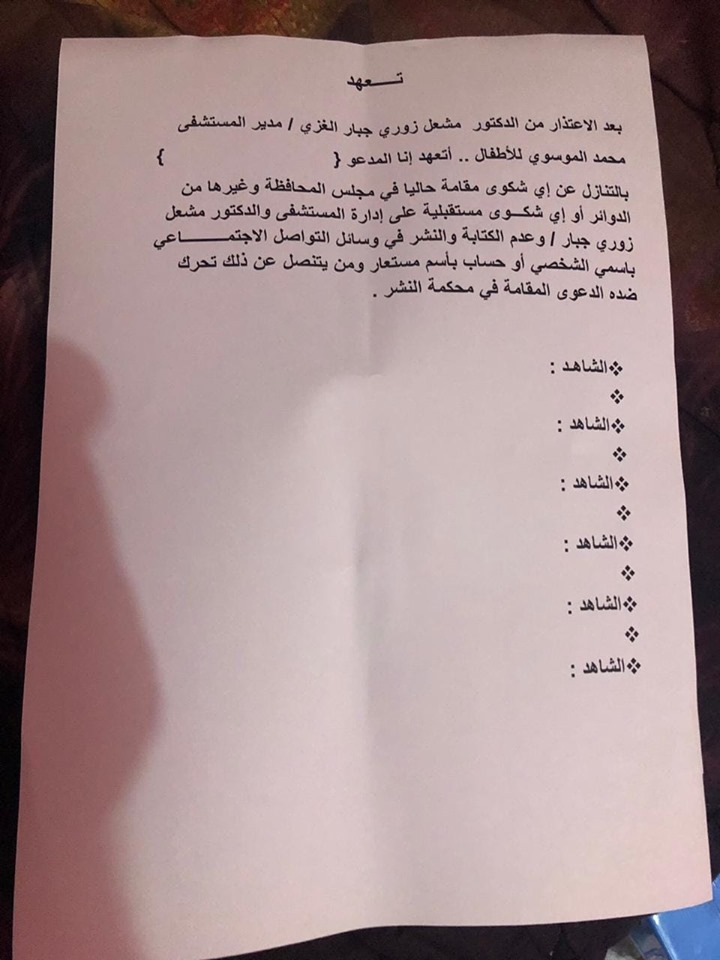 قال الناشط محسن الزيدي، اليوم الأحد بأن مدير مستشفى محمد الموسوي للأطفال قد هدد موظفيه بإجراءات تعسفية بعد أن حاول أن يأخذ تعهدات خطية منهم يتضمن بعدم النشر على إدارة المستشفى على مواقع التواصل الاجتماعي.