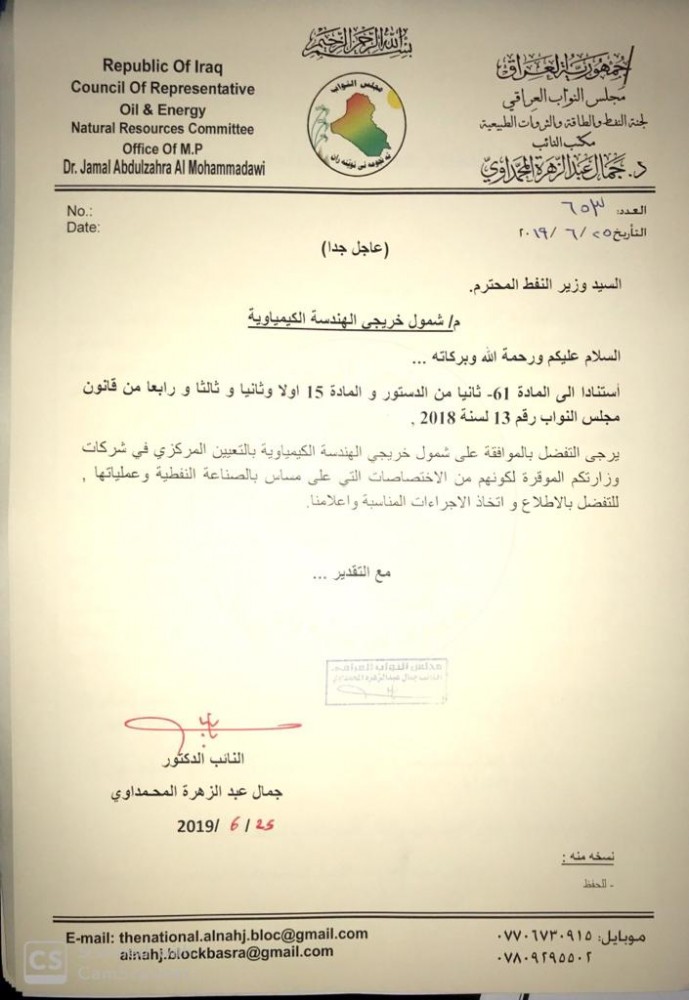 بالوثيقة…المحمداوي يطالب النفط بشمول خريجي الهندسة الكيمياوية بالتعيين المركزي