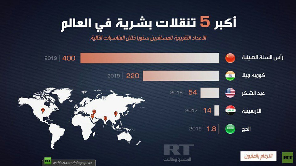 ونشر الموقع الاخباري الروسي، ما سماها “أكبر خمسة تنقلات بشرية في العالم”، حيث جاءت رأس السنة الصينية بالمركز الأول وقد شهد سفر نحو 400 مليون شخص هذا الشتاء، بينما أتى مهرجان كومبه ميلا الهندوسي الذي يستمر طيلة 50 يوما في المرتبة الثانية بحوالي 220 مليون شخص توجهوا للهند للعبادة والاغتسال.
