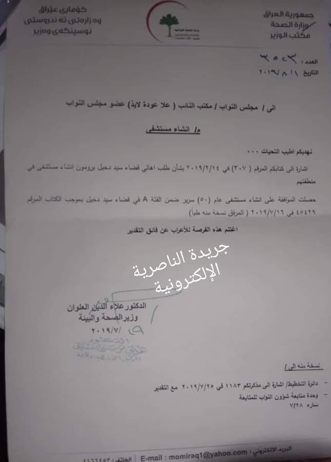 وبحسب طلب قدمته النائبة، عن محافظة ذي قار، علا الناشي، فأنه قد حصلت الموافقة من قبل وزير الصحة على انشاء مستشفى في قضاء سيد دخيل.