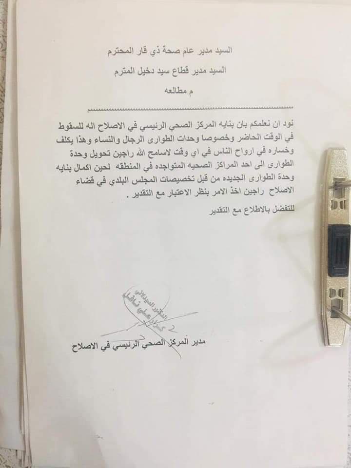 وبحسب الوثيقة، المرسلة من المركز الصحي الى دائرة صحة ذي قار وقطاع الرعاية الصحية، بضرورة ايجاد بديل في احد المراكز الصحية الاخرى، خشية من حصول حادث بداخل المركز الصحي.