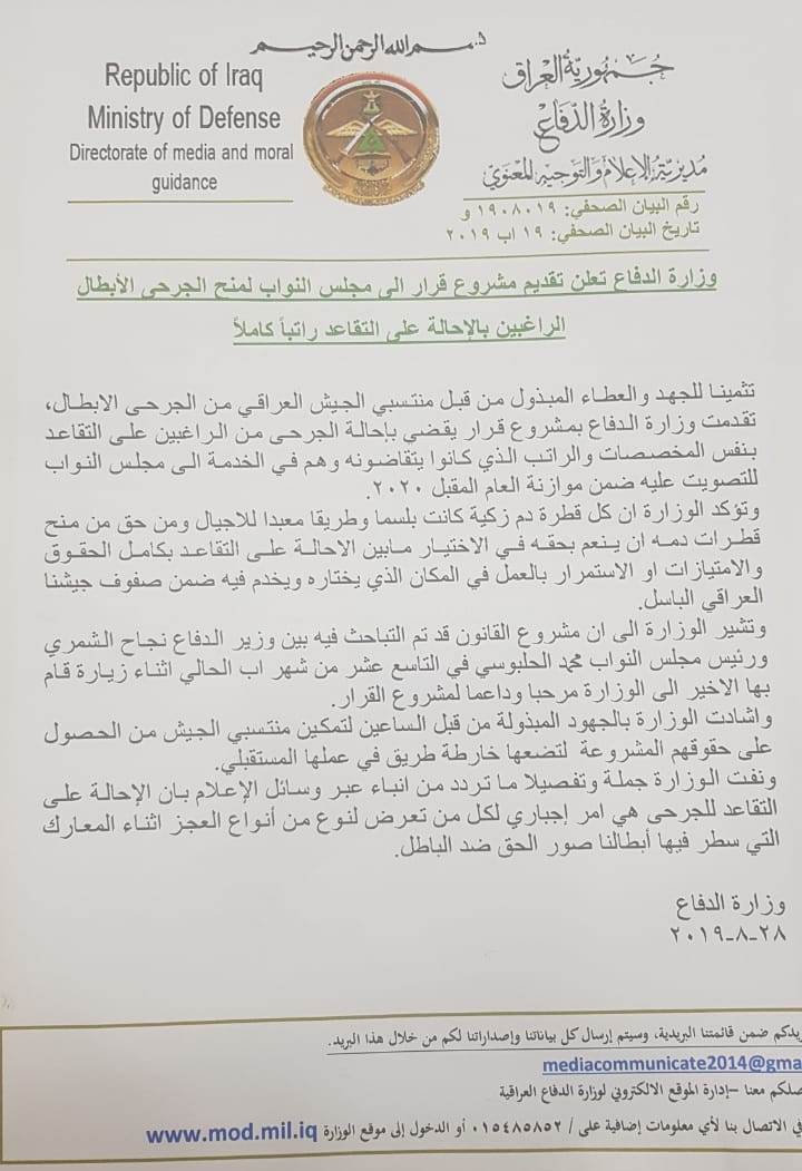 اخبار العراق وزارة الدفاع تقدم مشروع قرار للبرلمان “وثيقة” في 29/08/2019 جريدة الناصرية الالكترونية: أظهرت وثيقة حصلت عليها جريدة الناصرية الالكترونية، اليوم الخميس، على نسخة منها عن مقترح قدمته وزارة الدفاع للبرلمان لمنح الجرحى الراغبين بالإحالة على التقاعد راتباً كاملاً. شارك هذا الموضوع: النقر للمشاركة على X (فتح في نافذة جديدة) X انقر للمشاركة على فيسبوك (فتح في نافذة جديدة) فيس بوك مرتبط أكمل القراءة