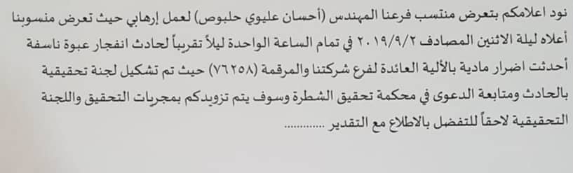 وبحسب وثيقة حصلت عليها جريدة الناصرية الالكترونية، جاء فيها عن تعرض المهندس احسان عليوي حلبوص وهو احد مهندسي الدائرة الى اعتداء بعبوة ناسفة، والتي رفعت فيها تقريرا الى كهرباء المنطقة الجنوبية.