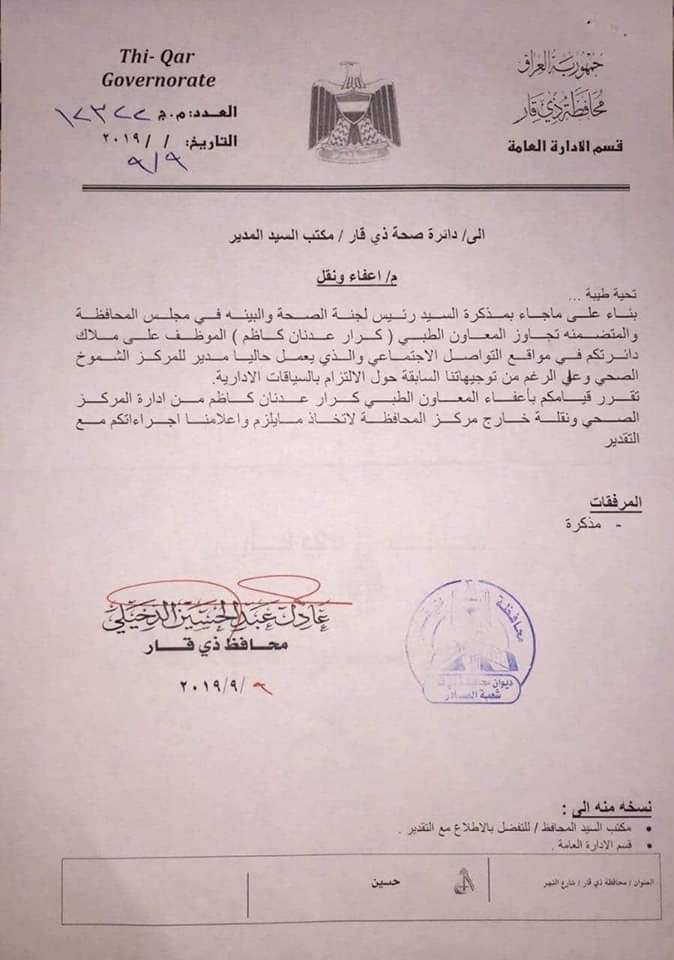 وذكرت وثيقة إنه “بناء على ما جاء بمذكرة السيد رئيس لجنة الصحة والبيئة في مجلس المحافظة والمتضمنة تجاوز المعاون الطبي (كرار عدنان كاظم) الموظف على ملاك دائرتكم في مواقع التواصل الاجتماعي والذي يعمل حالياً مديراً لمركز الشموخ الصحي، وعلى الرغم من توجيهاتنا السابقة حول الالتزام بالسياقات الإدارية تقرر قيامكم بإعفاء المعاون الطبي كرار عدنان، من إدارة المركز الصحي، ونقله خارج مركز المحافظة”.