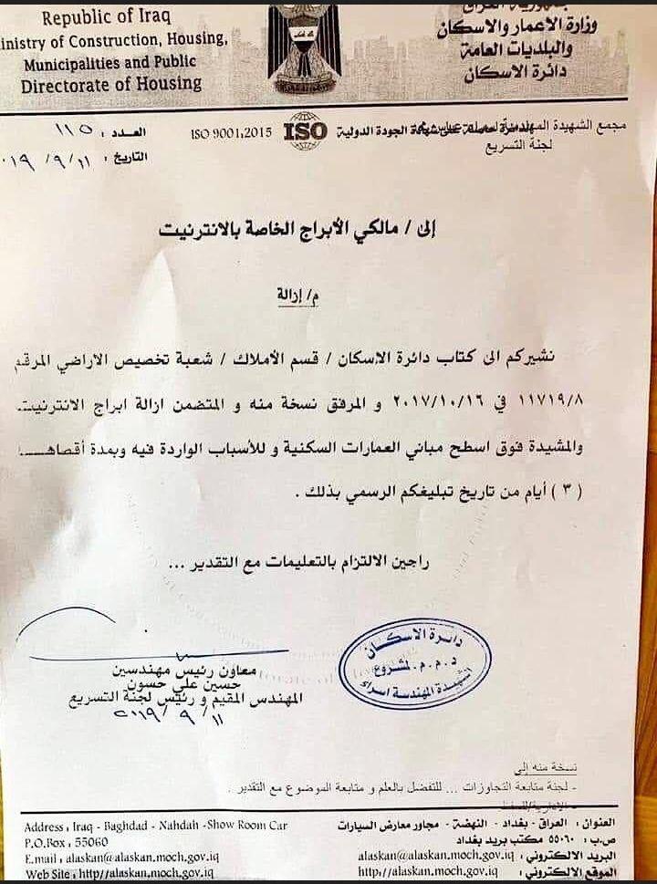 اخبار العراق بالوثيقة…الاعمار والبلديات توجه بإزالة أبراج الانترنت المشيدة فوق أسطح المباني آخر تحديث 12/09/2019 جريدة الناصرية الالكترونية: وجهت وزارة الاعمار والاسكان، اليوم الاربعاء، بإزالة ابراج الانترنيت المشيدة فوق اسطح المباني السكنية خلال مدة 3 ايام. شارك هذا الموضوع: النقر للمشاركة على X (فتح في نافذة جديدة) X انقر للمشاركة على فيسبوك (فتح في نافذة جديدة) فيس بوك مرتبط أكمل القراءة