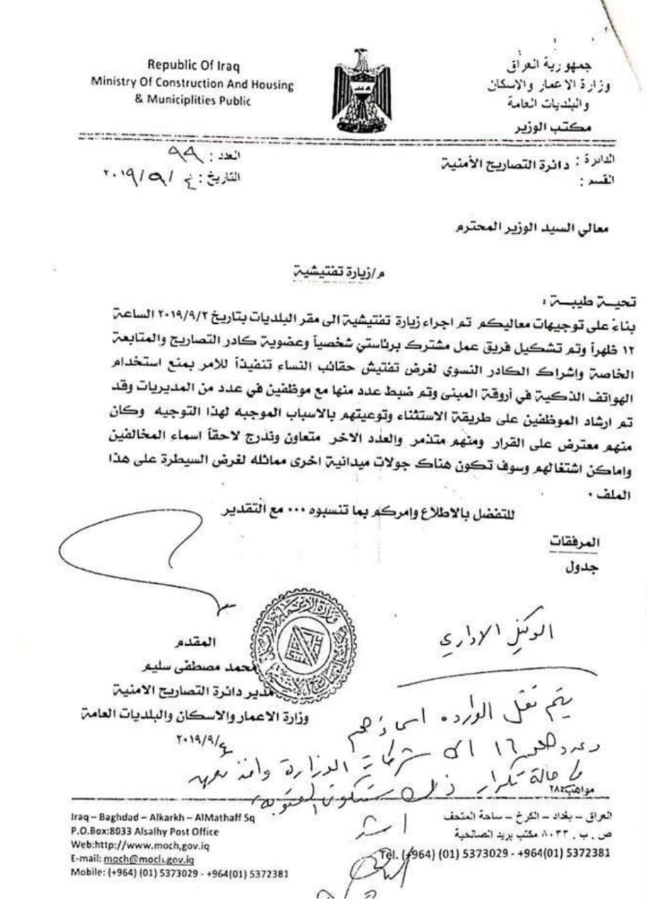 بالوثيقة.. الإعمار والاسكان تعاقب 21 موظفا لاستخدامهم الهاتف النقال