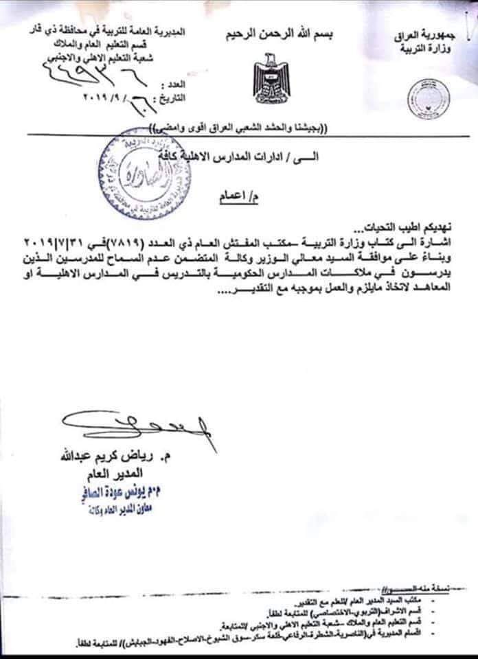 أخبار الناصرية بالوثيقة… تربية ذي قار تمنع ملاكها من التدريس في المدارس الأهلية في 17/09/2019 جريدة الناصرية الالكترونية: أعلنت تربية ذي قار، اليوم الثلاثاء، عن مباشرتها في منع ملاكها من التدريس في المدارس الاهلية في عموم المحافظة. شارك هذا الموضوع: النقر للمشاركة على X (فتح في نافذة جديدة) X انقر للمشاركة على فيسبوك (فتح في نافذة جديدة) فيس بوك مرتبط أكمل القراءة