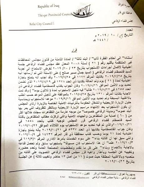 بالوثيقة… إقالة قائممقام قضاء الرفاعي من منصبه