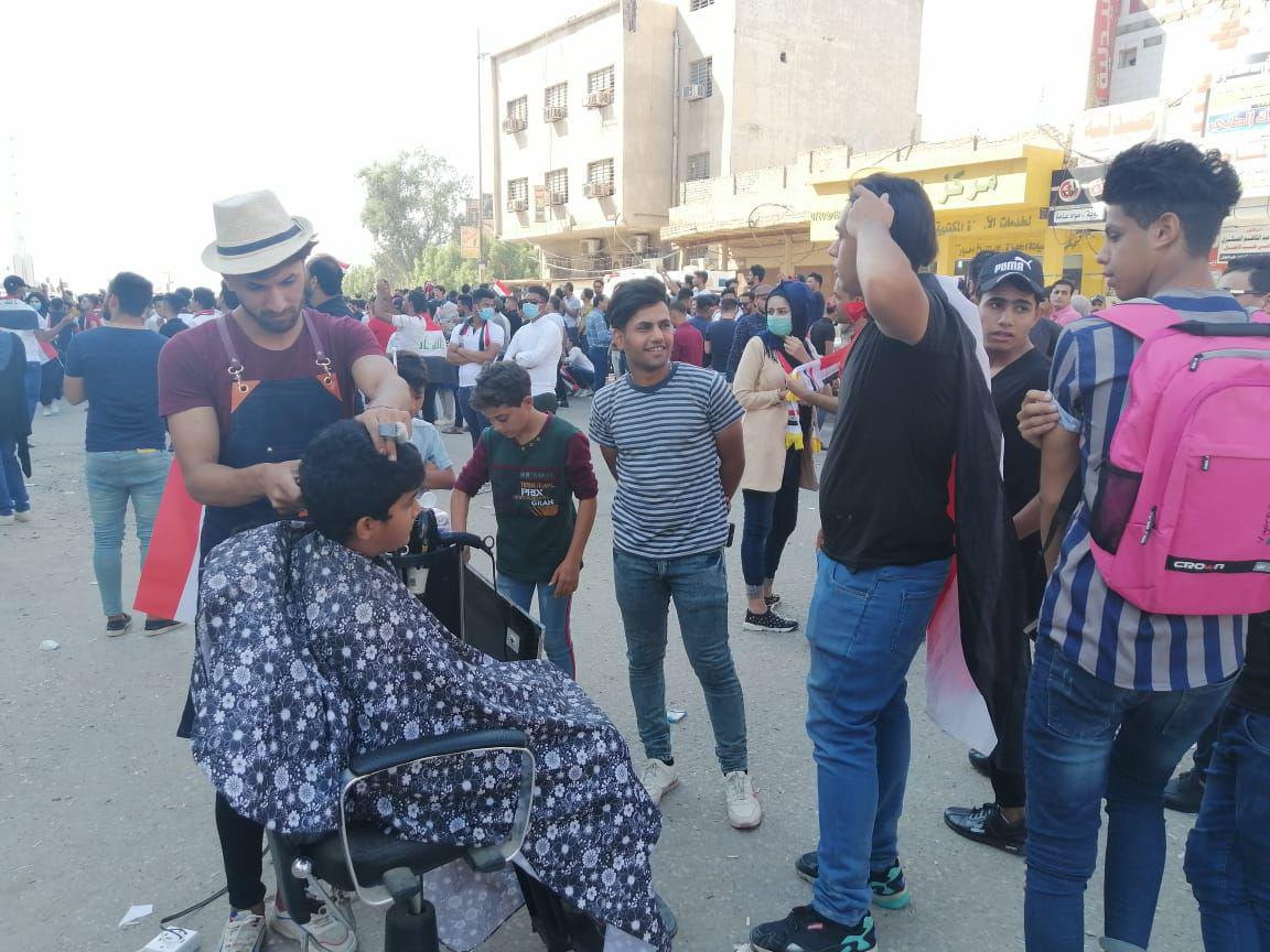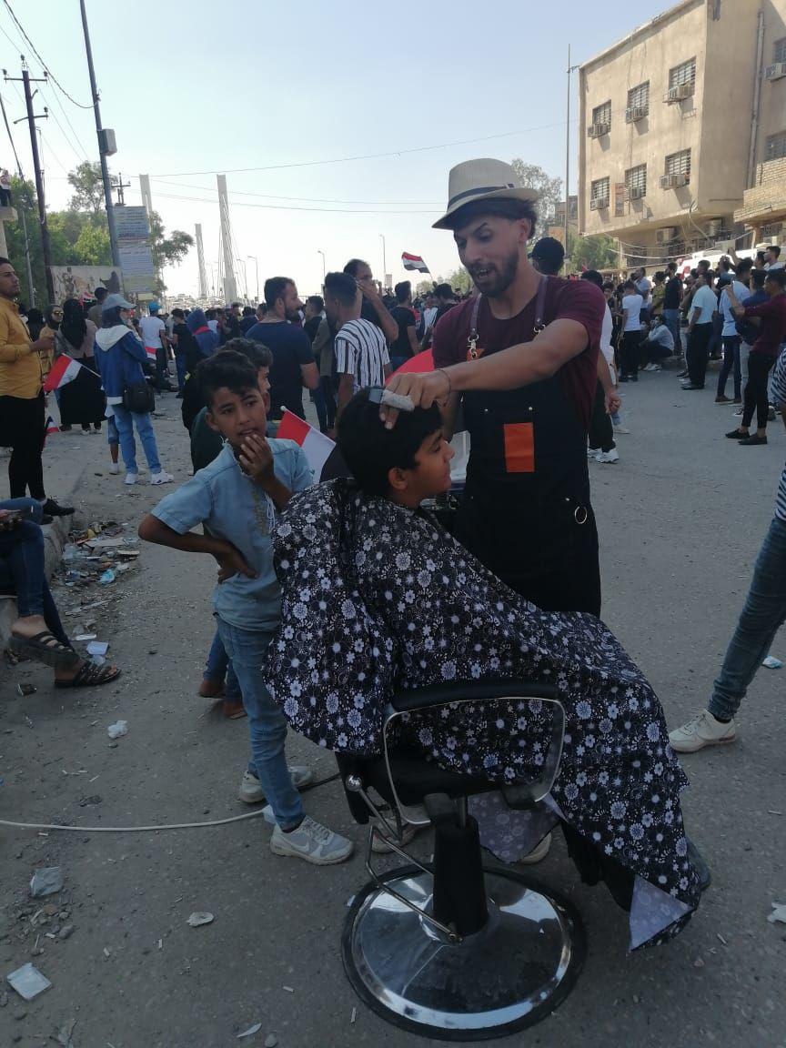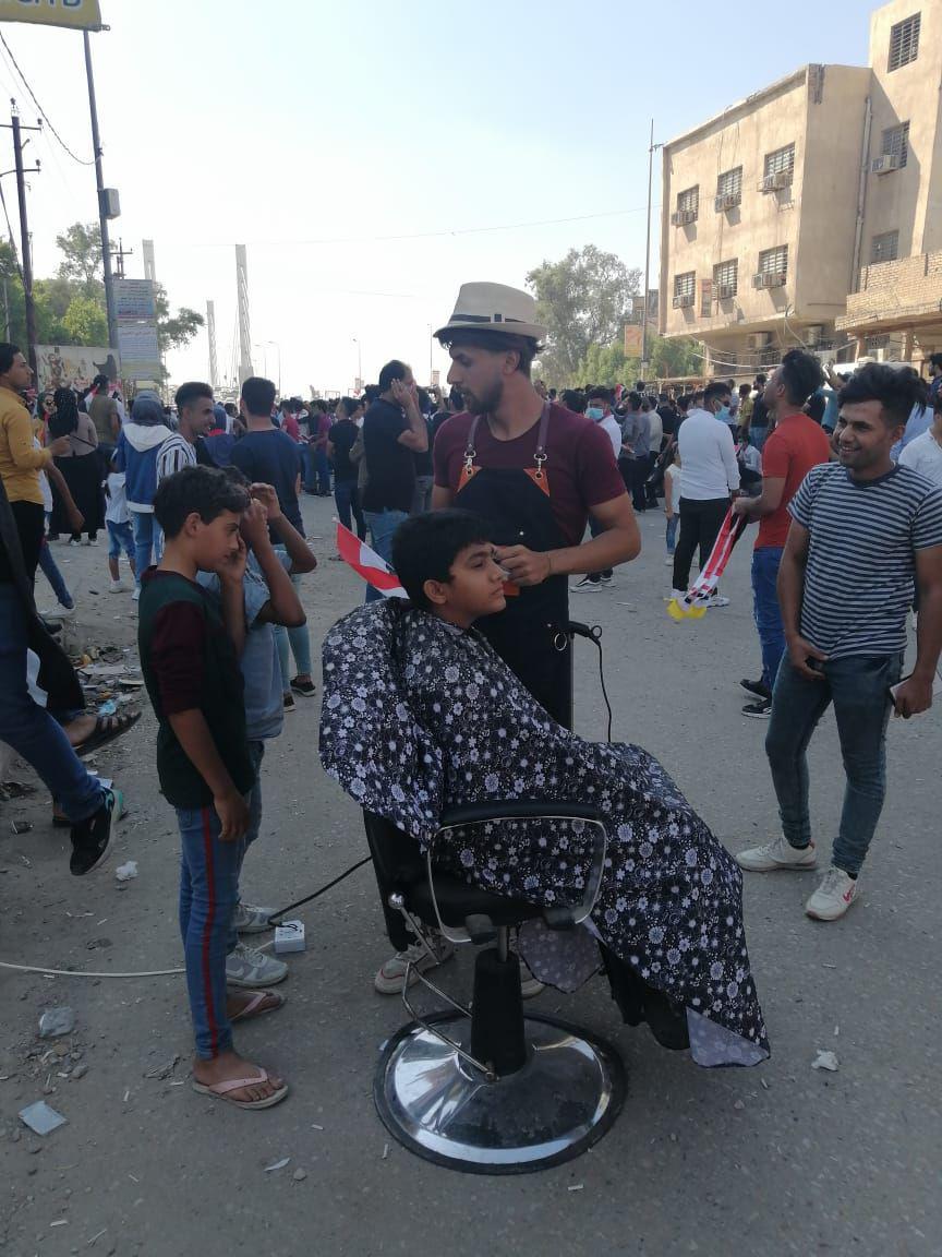وبينما يرتفع سقف المطالب وانضمام العديد من النقابات واصحاب المواهب والمهن في المحافظة الى التظاهرات، تبرع عدد من الشباب في فتح صالون حلاقة جوال وعلى الهواء الطلق للمتظاهرين.