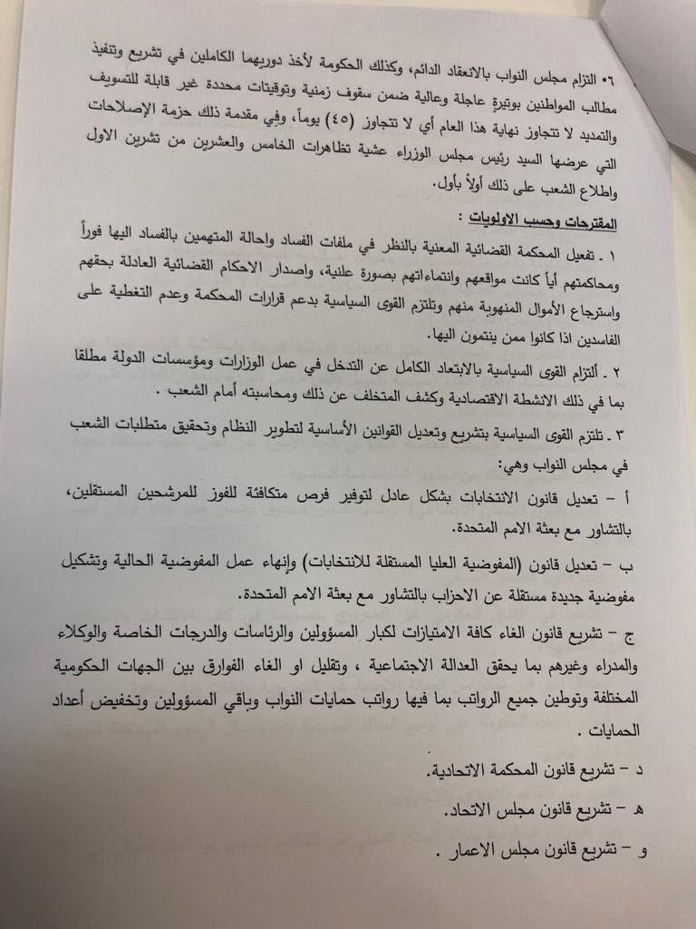 واصدر المجتمعون ستة قرارات وتوصيات اضافة الى خمسة مقترحات مهمة، فيما هددوا بسحب الثقة عن الحكومة واجراء انتخابات مبكرة اذا تبين عجز الحكومة او مجلس النواب تنفيذ المواد والخطوات المذكورة ضمن التوقيتات المشار اليها.