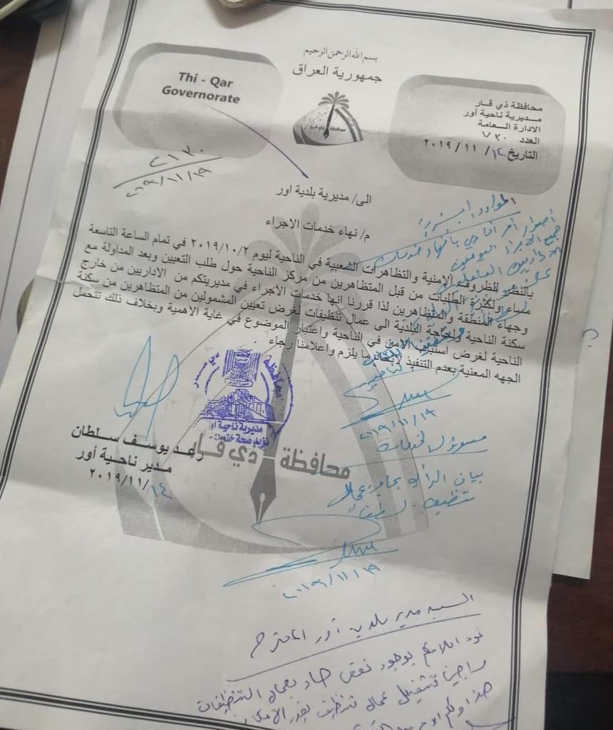 وبحسب وثيقة حصلت عليها جريدة الناصرية الالكترونية، فأن مدير الناحية رعد يوسف قد أكد بأنه خلال اجتماع مع وجهاء الناحية وكثرة طلبات المتظاهرين تم انهاء عمل موظفي الاجر اليوم لمن ليس من سكنة الناحية.