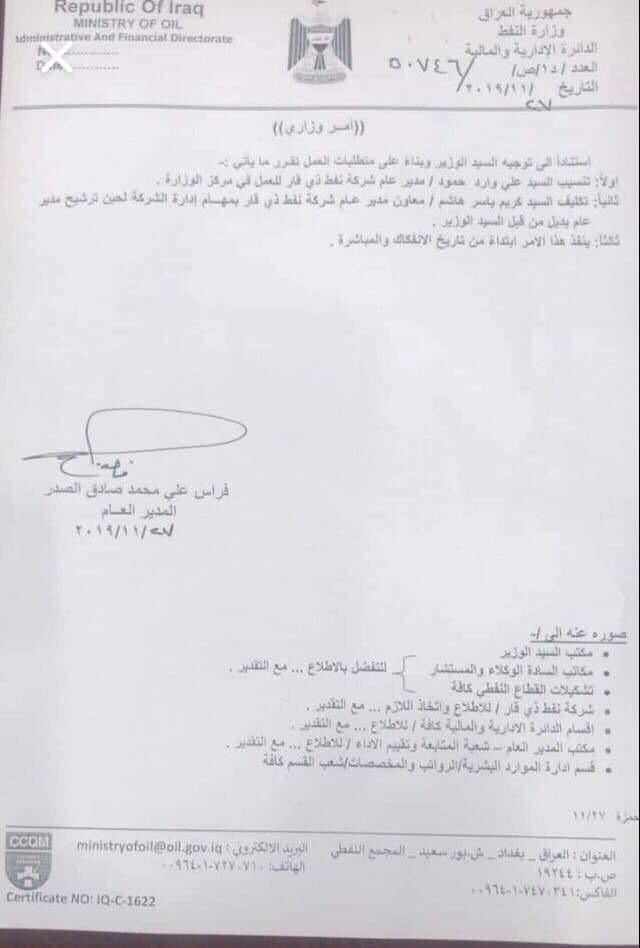 أخبار الناصرية بالوثيقة…تكليف كريم ياسر مديرا لشركة نفط ذي قار في 27/11/2019 جريدة الناصرية الالكترونية: أعلنت وزارة النفط، اليوم الاربعاء عن تكليف كريم ياسر مديرا لشركة نفط ذي قار، بدلا عن المدير السابق علي وارد الذي تم تنسيبه للعمل في مقر الوزارة. شارك هذا الموضوع: النقر للمشاركة على X (فتح في نافذة جديدة) X انقر للمشاركة على فيسبوك (فتح في نافذة جديدة) فيس بوك مرتبط أكمل القراءة