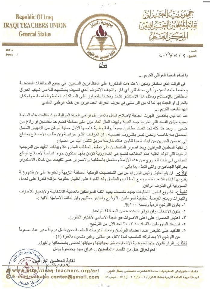 اخبار العراق نقابة المعلمين تقترح مبادرة من 5 نقاط للخروج من الأزمة في العراق في 03/12/2019 جريدة الناصرية الالكترونية: قدمت نقابة المعلمين في العراق، مبادرة تتضمن الخروج من الازمة في العراق. شارك هذا الموضوع: النقر للمشاركة على X (فتح في نافذة جديدة) X انقر للمشاركة على فيسبوك (فتح في نافذة جديدة) فيس بوك مرتبط أكمل القراءة
