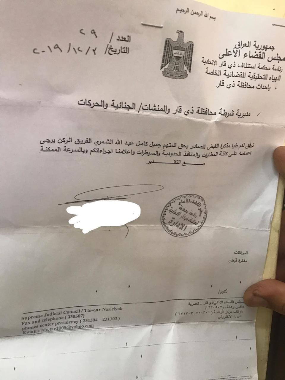 وبحسب الوثيقة التي حصلت عليها جريدة الناصرية الالكترونية، فقد تم تعميم مذكرة القبض على جميع المنافذ الحدودية والمطارات.