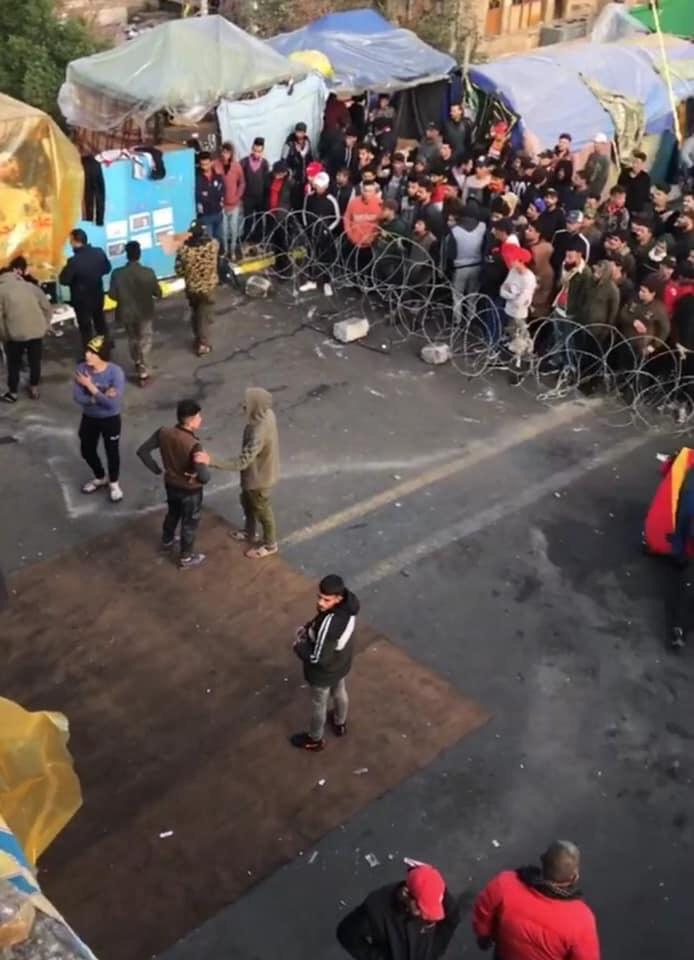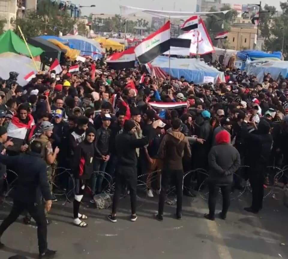 وضع عدد من المتظاهرين الاسلاك الشائكة واقاموا جدارا بشريا على مدخل جسر الجمهورية وسط بغداد، لمنع العبور على الجسر والتوجه نحو المنطقة الخضراء وسط بغداد.