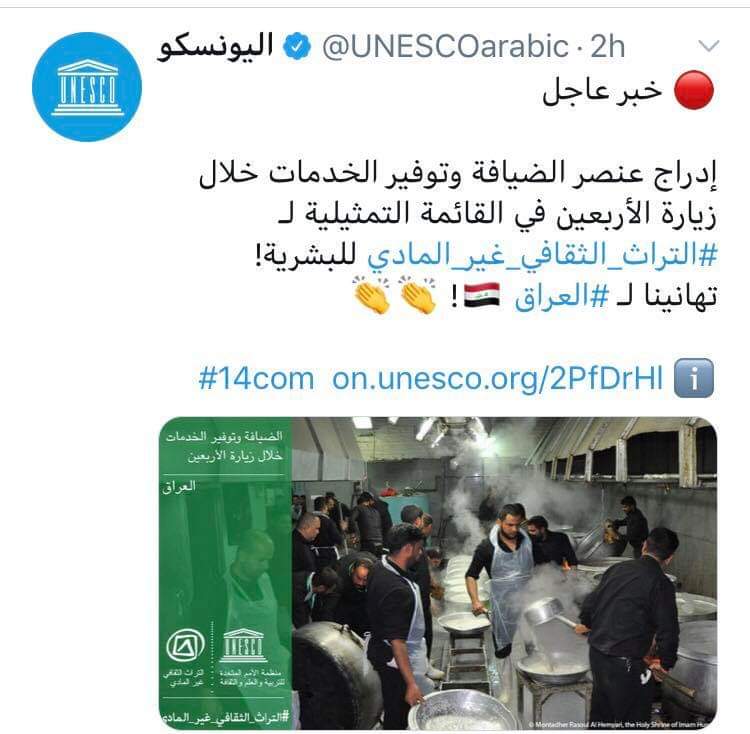 اخبار العراق إدراج ضيافة زيارة أربعين الامام الحسين في القائمة التمثيلية لليونسكو في 12/12/2019 جريدة الناصرية الالكترونية: أدرجت منظمة اليونسكو، اليوم الخميس، عنصر الضيافة خلال زيارة أربعين الأمام الحسين عليه السلام، في القائمة التمثيلية للتراث الثقافي غير المادي البشري. شارك هذا الموضوع: النقر للمشاركة على X (فتح في نافذة جديدة) X انقر للمشاركة على فيسبوك (فتح في نافذة جديدة) فيس بوك مرتبط أكمل القراءة