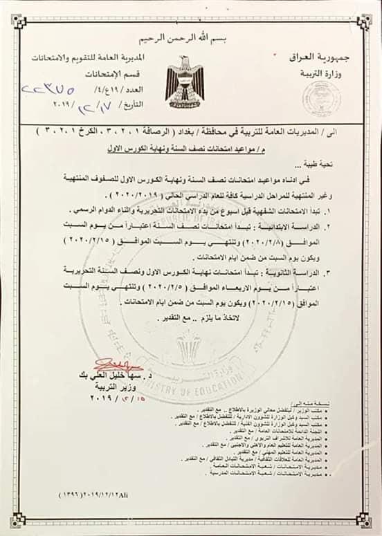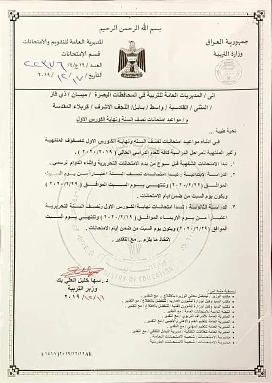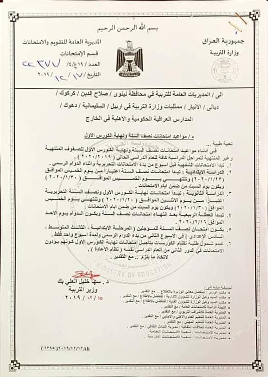 وأوضح، أنه “بخصوص موعد الامتحانات لمديريات محافظات (نينوى، صلاح الدين، كركوك، ديالى، الأنبار، ممثليات وزارة التربية في أربيل والسليمانية ودهوك، بالإضافة إلى المدارس العراقية الحكومية والأهلية في الخارج)، فستبدأ امتحانات الابتدائية لنصف السنة اعتبارا من يوم الخميس الموافق 23/1/2020 وتنتهي يوم الخميس الموافق 30/1/2020، ويكون يوم السبت من ضمن أيام الامتحانات، والدراسة الثانوية ستكون امتحانات نهاية الكورس الأول ونصف السنة التحريرية يوم الاثنين الموافق 20/1/2020 وتنتهي الخميس 30/1/2020 ويكون يوم السبت من ضمن أيام الامتحانات أيضاً”.