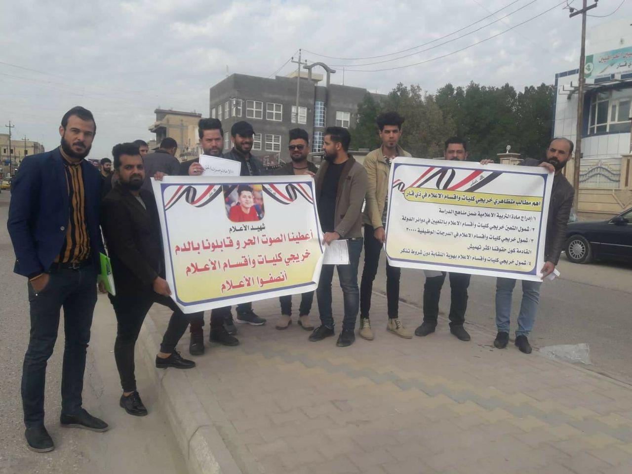 تظاهر عدد من خريجي كليات وأقسام الاعلام في الناصرية، اليوم مطالبين في انصافهم أسوة بأقرانهم من خريجي الكليات الاخرى في التعيين وادراج المادة الاعلامية في المناهج والحصول على هوية نقابة الصحفيين بدون شروط.