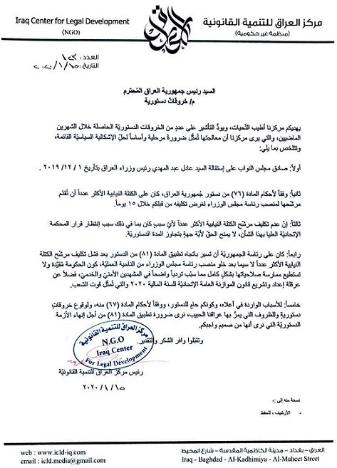 وجه مركز العراق للتنمية القانونية )ICLD(، اليوم الخميس، كتاباً إلى رئاسة الجمهورية طالبها فيه بضرورة تطبيق المادة )٨١( من الدستور بهدف إنهاء الأزمة الدستورية التي تمر بها البلاد منذ قرابة الشهرين على خلفية استقالة رئيس مجلس الوزراء.