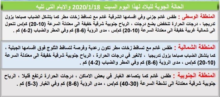 وقالت الهيئة في تقريرها، ان “الطقس اليوم السبت في المنطقة الوسطى سيكون غائم جزئي وفي اقسامها الشرقية غائم مع تساقط زخات مطر وانخفاض تدريجي بدرجات الحرارة”، مبينة ان المنطقة الشمالية سيكون الطقس غائم مع تساقط زخات مطر تكون رعدية وفرصة لتساقط الثلوج فوق اقسامها الجبلية، فيما سيكون الطقس في المنطقة الجنوبية مع ارتفاع قليل في درجات الحرارة”.