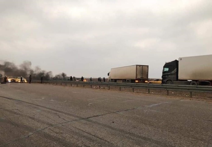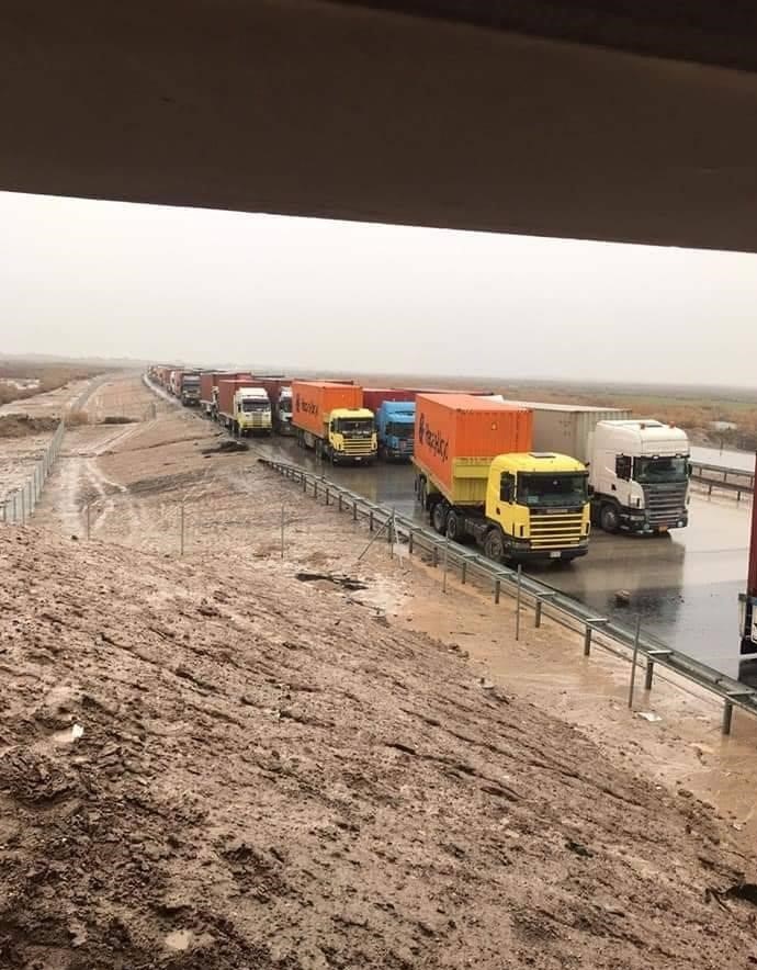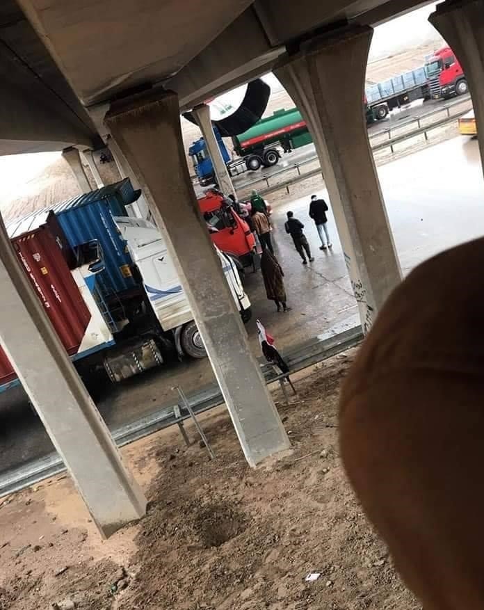 وأظهرت صور توثق استمرار قطع الطريق الدولي المار بالمحافظة، وتُظهر طوابير طويلة لشاحنات نقل، ممنوعة من العبور.