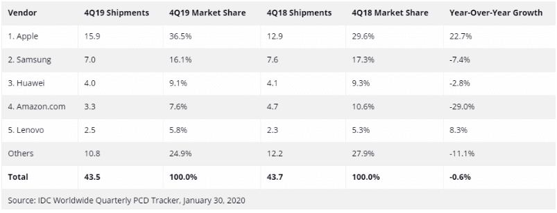 ووفقاً لبيانات من شركة أبحاث السوق آي دي سي IDC، فقد تقلص سوق الأجهزة اللوحية لعام 2019 بأكمله بنسبة 1.5%، على أساس سنوي، مع بلوغ إجمالي الشحنات العالمية 144 مليون وحدة.