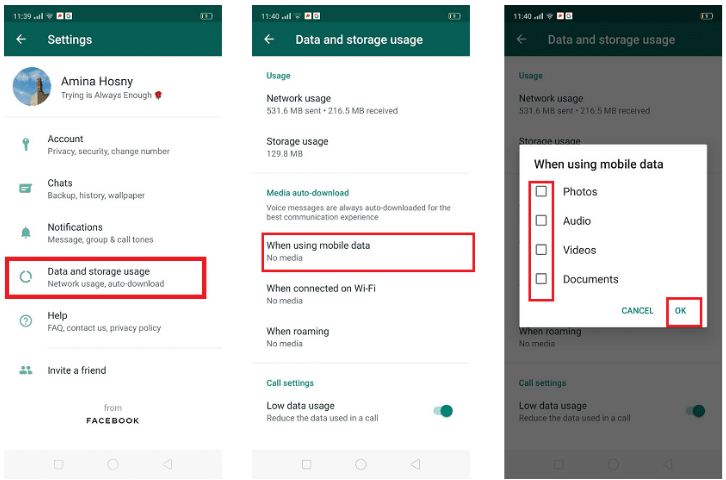 - اضغط على خيار (عند استخدام بيانات الهاتف)، ثم قم بإلغاء تحديد مربع الاختيار الموجود بجوار كل من الصور، والملفات الصوتية، ومقاطع الفيديو، والمستندات حسب رغبتك.