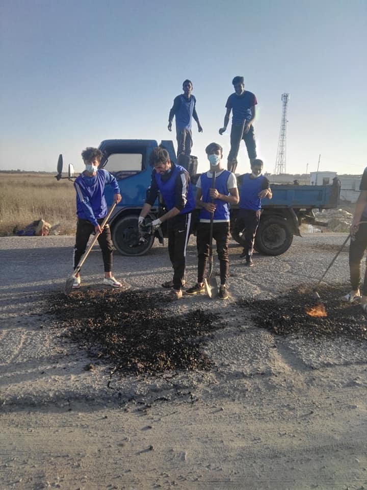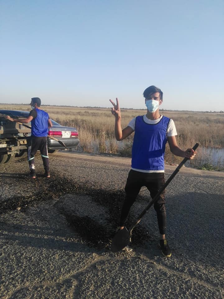 شاهد..بعد إستلامهم لمنحة الطوارئ..شباب يتبرعون بتصليح وإكساء تخسفات طريق في سوق الشيوخ