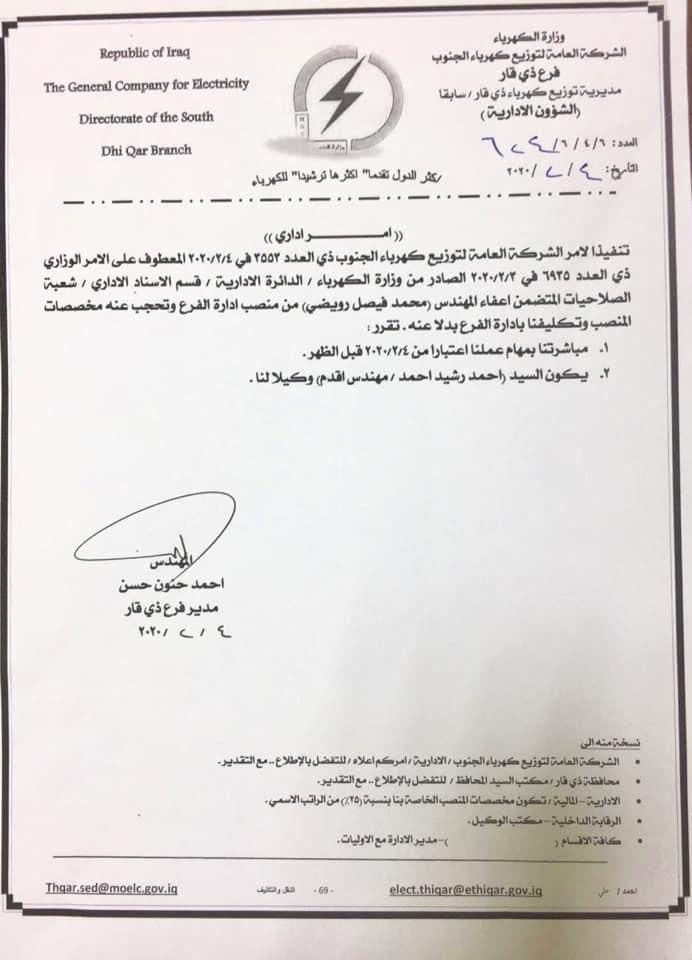بالوثيقة…أحمد حنون مديرا لفرع توزيع كهرباء ذي قار