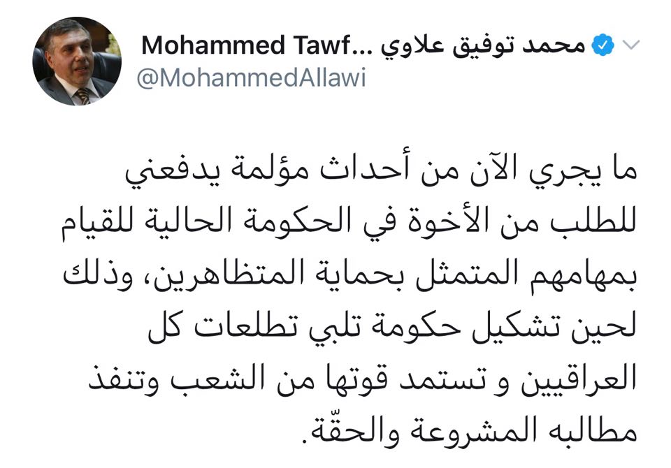 وقال علاوي في تدوينة، إن “ما يجري الآن من أحداث مؤلمة يدفعني للطلب من الأخوة في الحكومة الحالية للقيام بمهامهم المتمثلة بحماية المتظاهرين، وذلك لحين تشكيل حكومة تلبي تطلعات كل العراقيين وتستمد قوتها من الشعب وتنفذ مطالبه المشروعة والحقّة”.