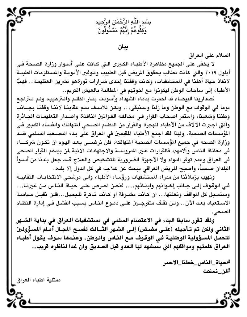 أطباء العراق يقررون تأجيل الاعتصام السلمي في المستشفيات إلى الشهر المقبل