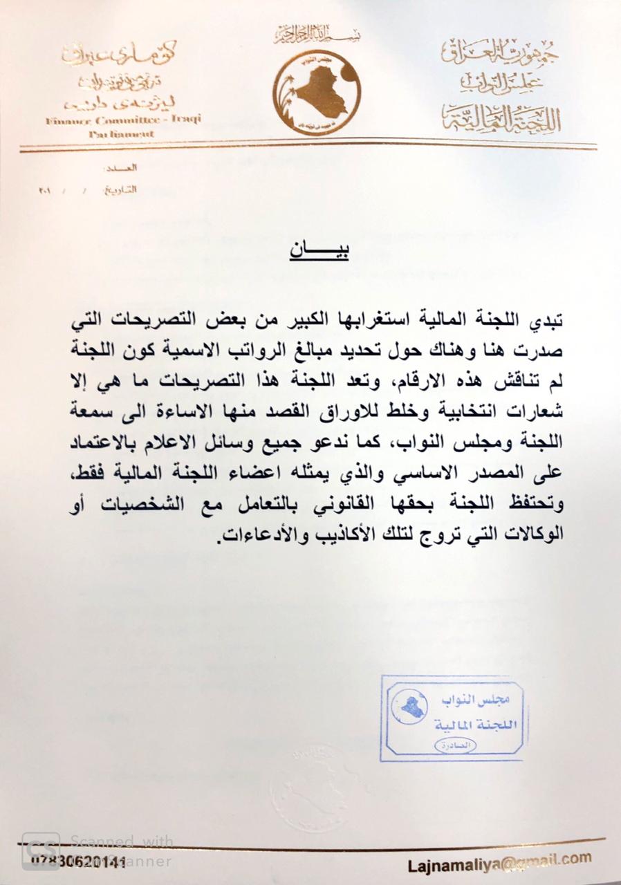 ودعت اللجنة “جميع وسائل الاعلام بالاعتماد على المصدر الاساسي والذي يمثله اعضاء اللجنة المالية فقط”، مشيرة الى انها “تحتفظ بحقها القانوني بالتعامل مع الشخصيات أو الوكالات التي تروج لتلك الأكاذيب والأدعاءات”.