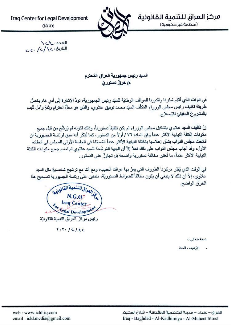 وأكد المركز تقديره للظروف الاستثنائية التي تمر بها البلاد، ووقوفه مع ترشيح شخصية مثل السيد علاوي إلا أن ذلك لا ينبغي أن يكون مخالفاً للضوابط الدستورية، مطالباً رئاسة الجمهورية بتصحيح هذا الخرق الواضح.