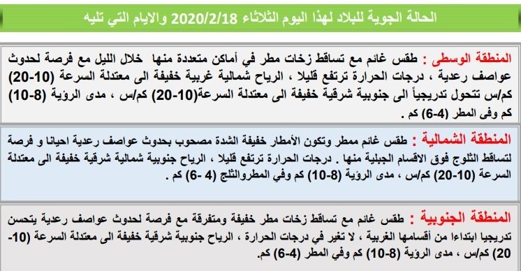 وقالت الهيئة في بيان ان “طقس اليوم في المنطقة الوسطى سيشهد تساقط زخات مطر في أماكن متعددة منها خلال الليل مع فرصة لحدوث عواصف رعدية فيما ترتفع درجات الحرارة قليلا”، مبينا ان “الطقس في المنطقة الشمالية لليوم غائم ممطر مصحوب بحدوث عواصف رعدية احيانا وفرصة لتساقط الثلوج فوق الاقسام الجبلية منها”.