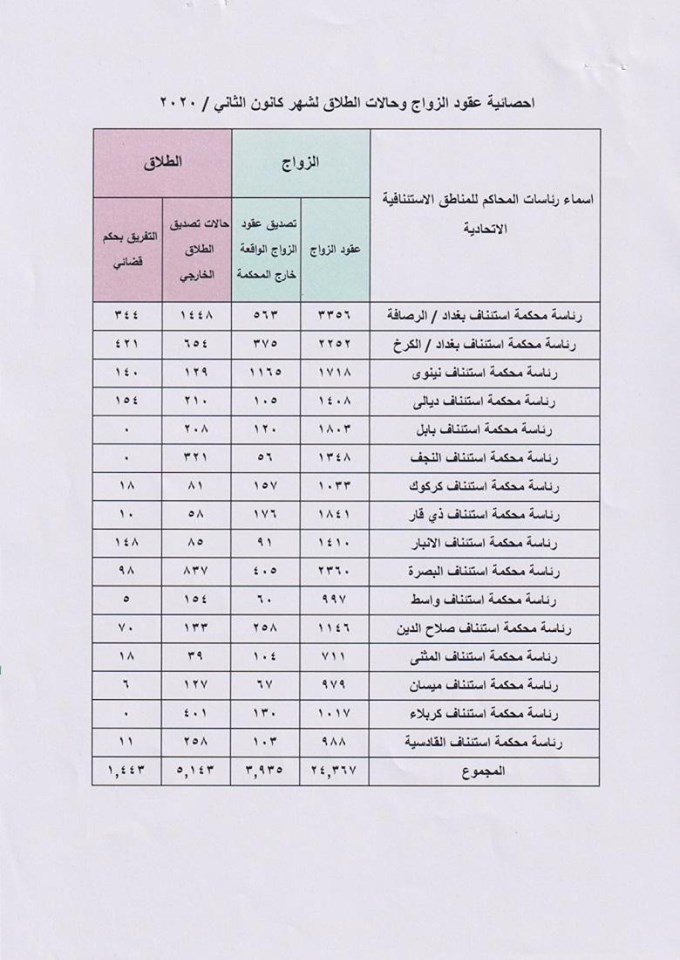 وتظهر الوثيقة، أن مجموع حالات تصديق الطلاق الخارجي المسجلة في محاكم جميع المحافظات العراقية، عدا إقليم كردستان، خلال كانون الثاني الماضي، بلغ 5،143 حالة، فيما بلغ مجموع حالات التفريق بحكم قضائي 1443.
