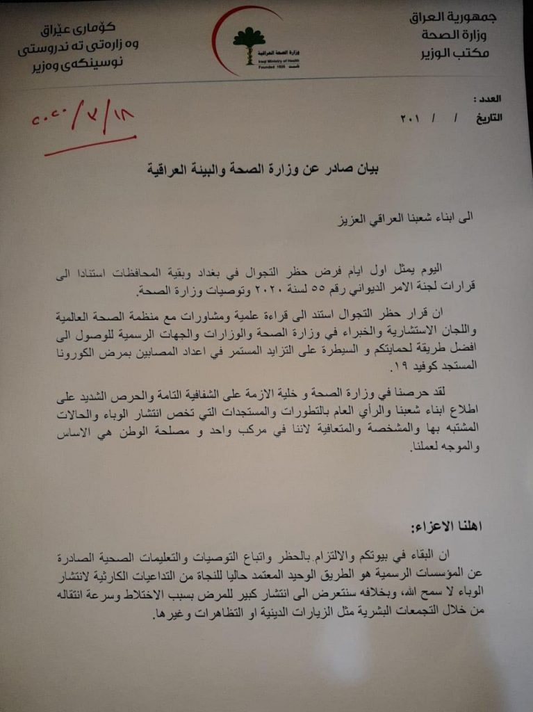 ودعت وزارة الصحة والبيئة، الأربعاء، المواطنين الى الالتزام بقرار حظر التجوال، وذلك في اليوم الاول لتطبيق الحظر في بغداد وباقي المحافظات، مبينة ان “حظر التجوال جاء لحمايتكم والسيطرة على التزايد المستمر في اعداد المصابين بمرض كورونا المستجد كوفيد-19”.