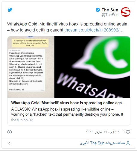 وتقول الرسالة الخادعة، التي تظهر كل عامين: “إذا كنت تعرف أي شخص يستخدم “واتساب”، فيمكنك نقل هذا. نصح زميل في مجال تكنولوجيا المعلومات بأن فيديو يخرج غداً من “واتساب”، يسمى martinelli يجب عدم فتحه. إنه يخترق هاتفك ولا شيء سيصلحه. انشر الرسالة”.