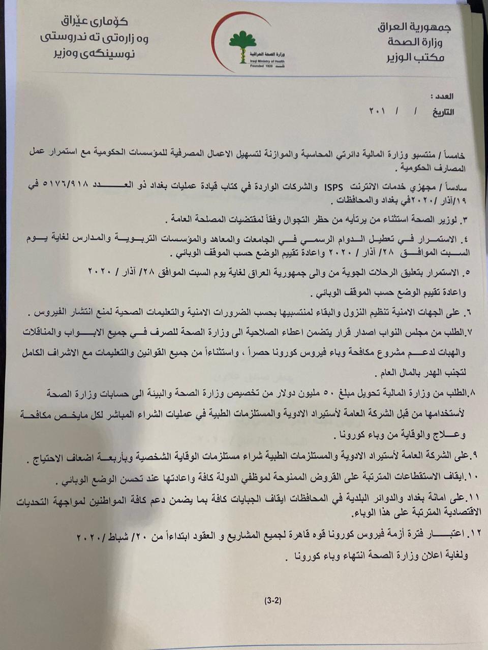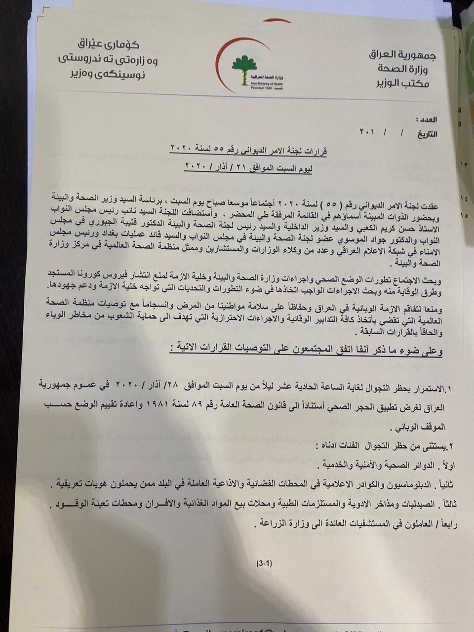 كذلك قررت الخلية بالاستمرار بتعليق الرحلات الجوية لغاية مساء السبت المقبل وإعادة تقييم الوضع حسب الموقف الوبائي، واعتبار فترة أزمة فايروس كورونا “فترة قاهرة” لجميع المشاريع والعقود.